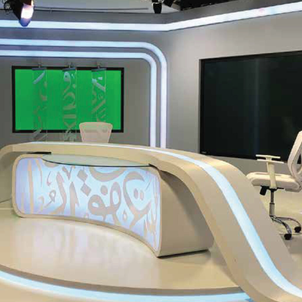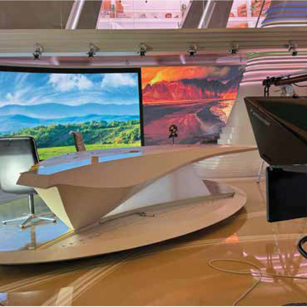This state-of-the-art set boasts a remarkable level of versatility, with the ability to adapt to any color light and be updated accordingly. At the center of the set is a large video wall on the right, accompanied by a sleek curved desk, providing the perfect platform for news presenters to anchor their coverage. On the left side, a series of multi screens add a dynamic element to the set, while a touch screen interface allows for quick and efficient access to the latest news updates. With meticulous attention to detail and an unwavering commitment to quality,