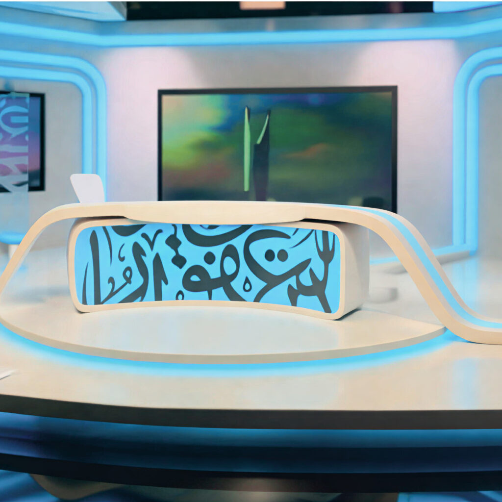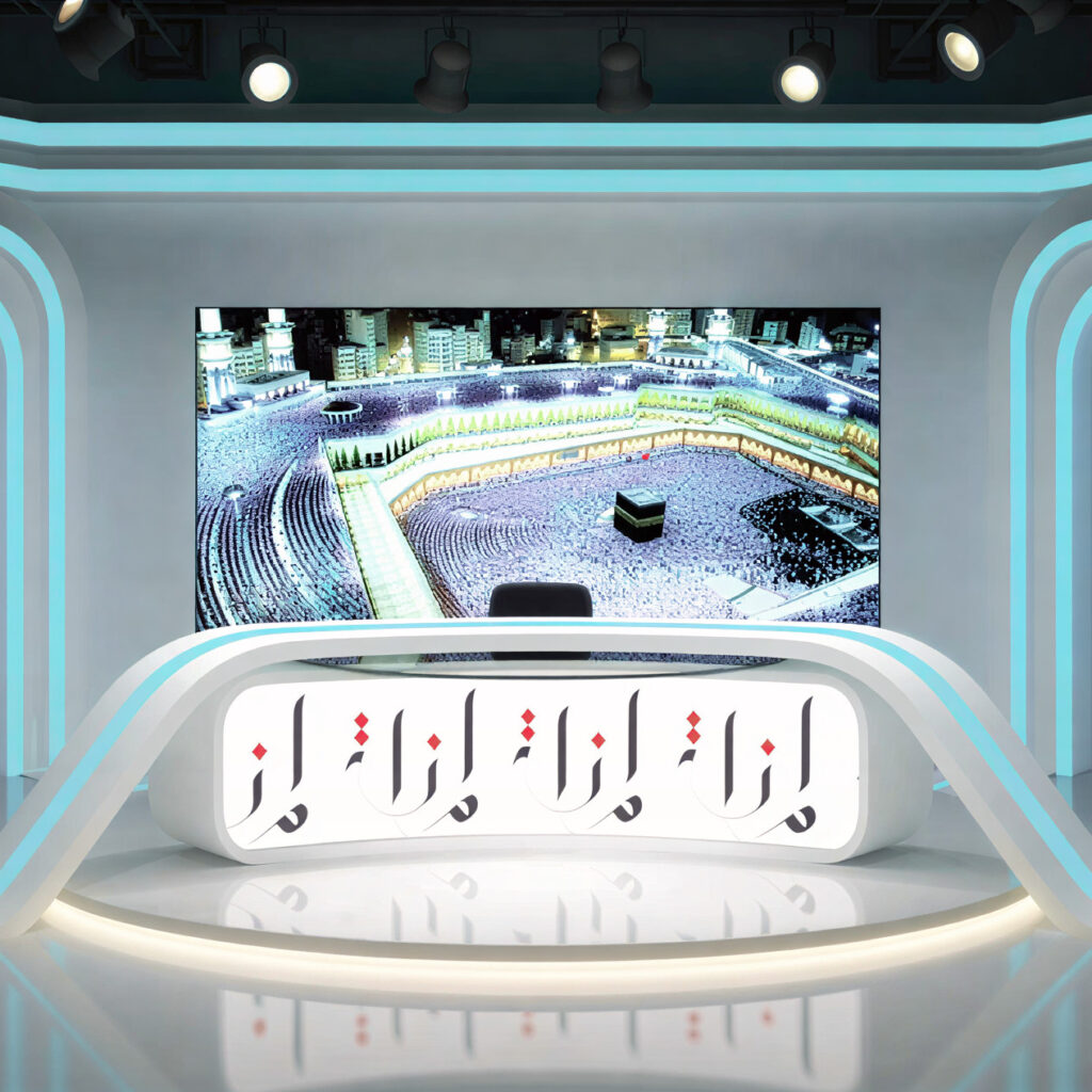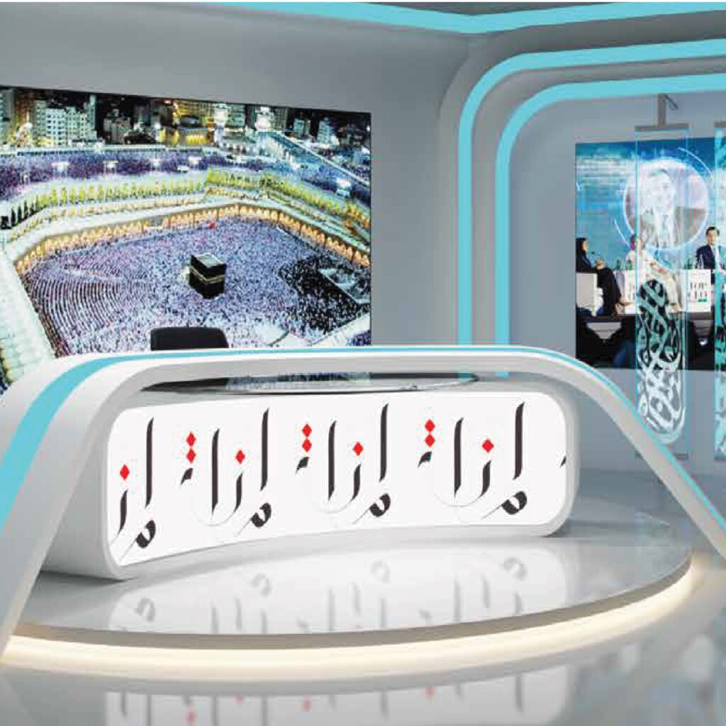 Design & Concept of this studio is purely based on the theme of religious Program Colour pallete is specifically chosen for it, with serene colors & Minimalistic approach Soft edges overall, be it in LED Lighting or Table design, also compliment the theme Addition of calligraphy in negative space is additional feature to complete the idea Season Idea provides its expertise in realizing the design into actual set. It was finished in Melamine flooring with inset LED lights and luminous wall cladding. Customized anchor table was also completed as per design & layouts specifically done for it Acrylic stand with illuminated calligraphy samples serve the purpose of not only theme completion but also are movable to adjust Lighting according to Camera angle