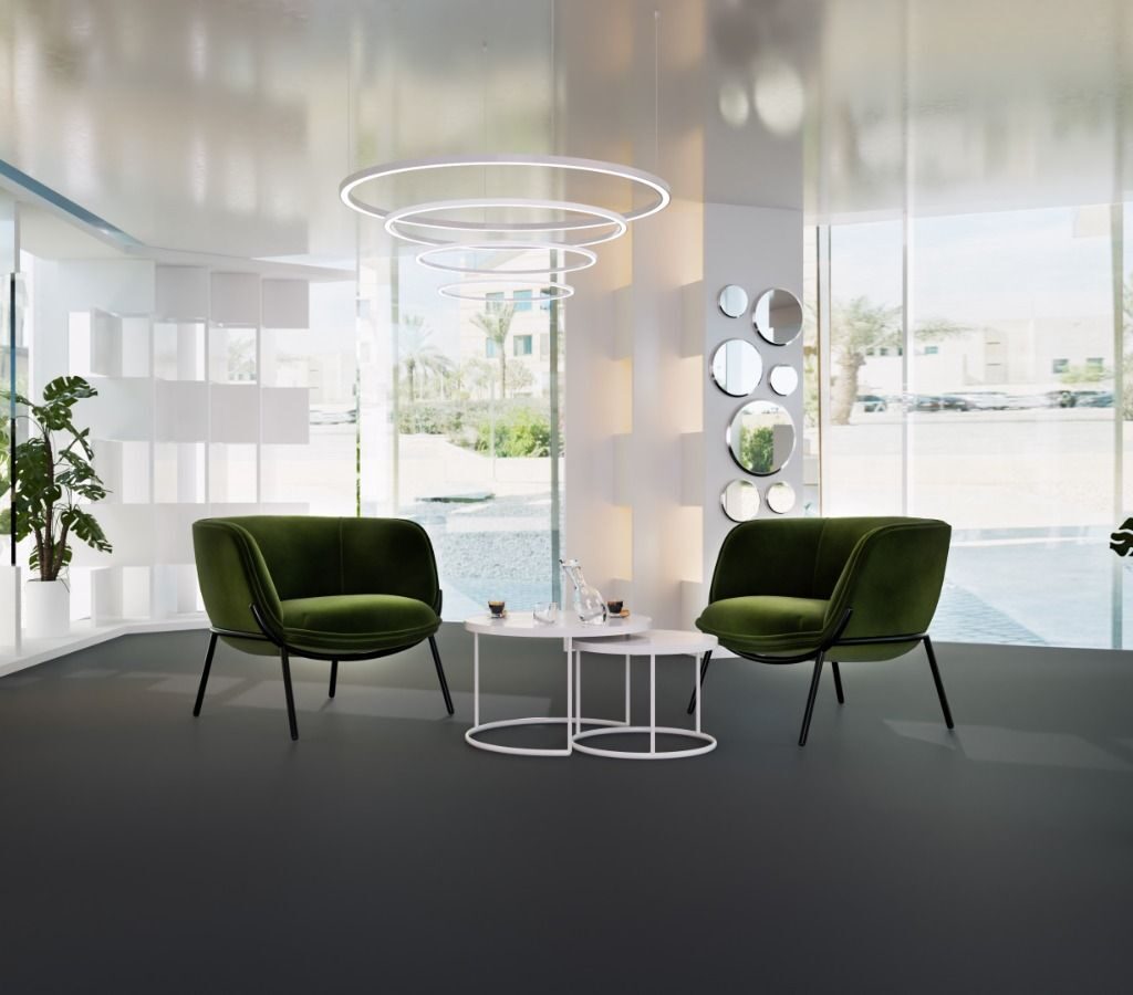 The Studio composition is a formal, symmetrical arrangement of seating areas and a light-filled wall installation. Two matching armchairs face each other, centrally positioned, with a coffee table between them. The walls feature a striking modular design of light-colored squares that create visual interest and seem to be illuminated from within. Other decorative elements, including plants and framed art, are strategically placed to add texture and visual appeal. The shot appears to be a well-composed interior design display, focused on presenting the aesthetic and functionality of the space